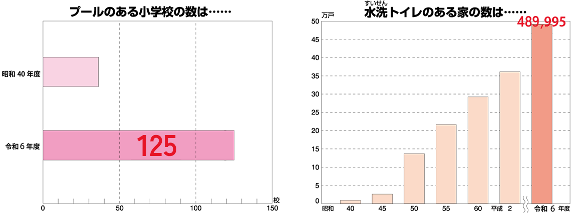 むかしの洗たくは、洗たく板やたらいを使って手で洗っていましたが、今はほとんどの家が洗たく機で洗っています。それに水洗トイレもふえました。学校のプールがふえたり、まちにはふん水や公衆トイレがつくられたりするなど、 わたしたちのくらしは水をたくさん使う生活にかわってきました。