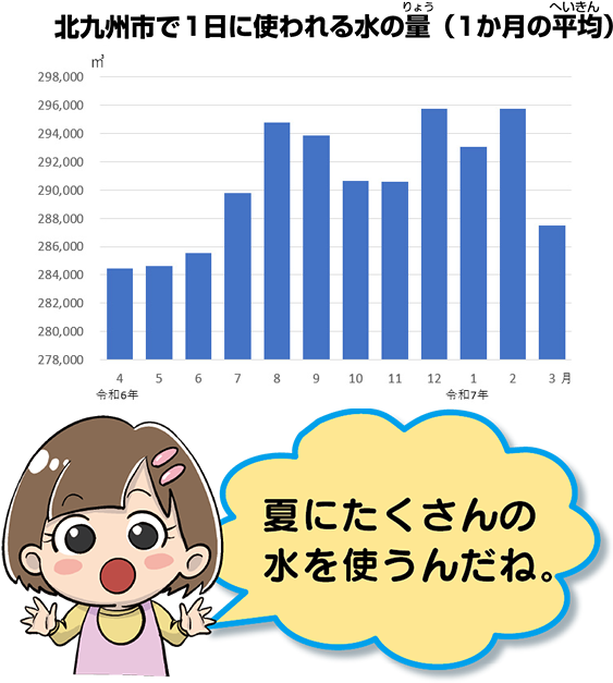 しかし、水道の水は1年中同じように使われているのではありません。暑い夏の日や、大そうじをしたり、多くの人が集まったりする年末年始には、たくさんの水が使われます。