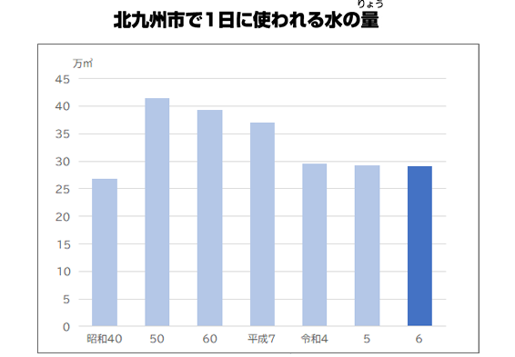昭和 50年度まで、水の量はふえましたが、そのあとは、人口がへったり、水をあまり使わない 洗たく機 やトイレなどがふえたりしたため、北九州市で使われる水の量は、少しずつへってきました。